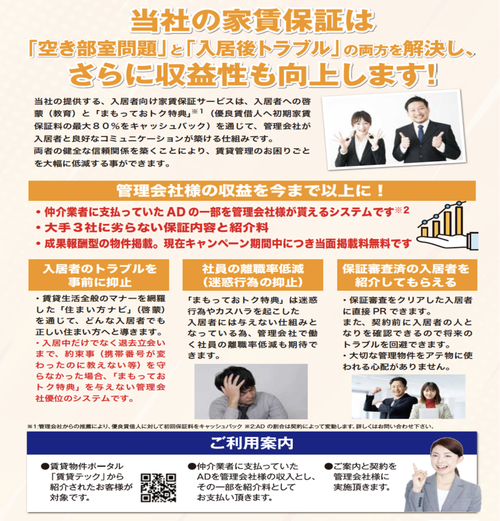 弊社の提供する賃借人向けの保証サービスは、賃借人への啓蒙(教育)とお祝いキャッシュバック制度を通じて、管理会社様が賃借人と良好なコミュニケーションが築ける仕組みを作りました。